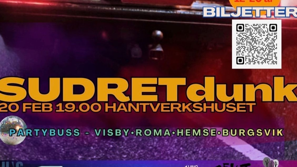 Sportlovet drar igång på bästa sätt när Sudretsällskapet, Sudrets egen kung, intar Hantverkshuset Burgsvik för en kväll fylld av musik och en maxad fest! För dig som är 12-20 år. Gratis bussar från Visby, Roma och Hemse
